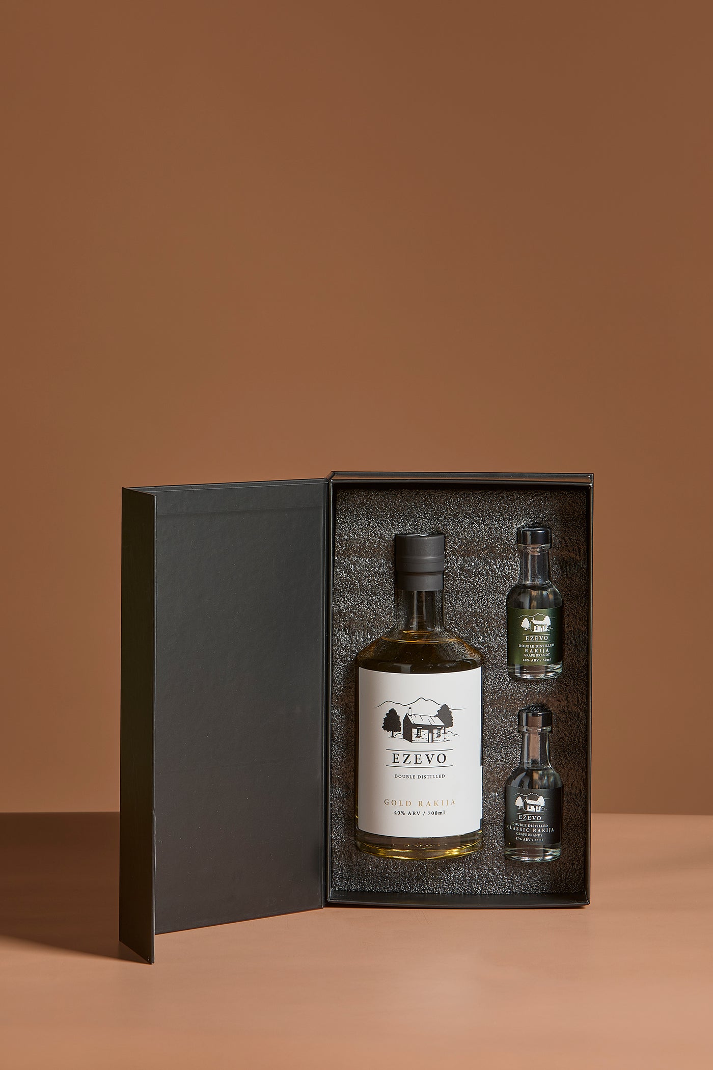 Ezevo Gold Gift Set: Ezevo Gold Rakija 700ml, Ezevo Clear Rakija 50ml, Ezevo Classic Rakija 50ml